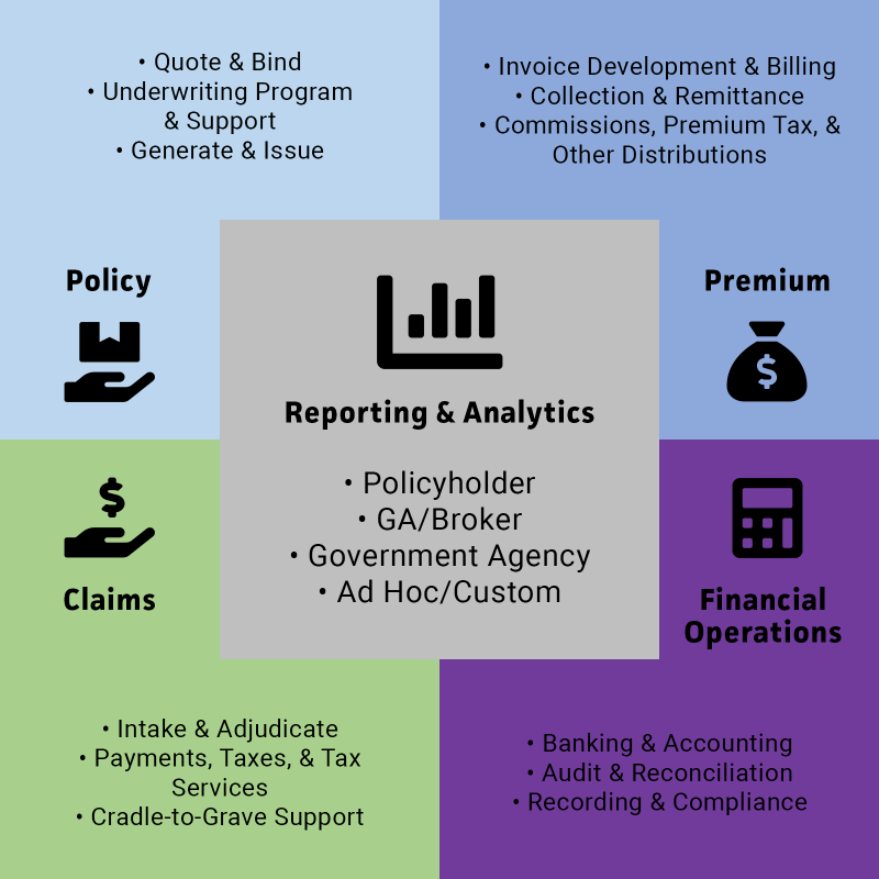 We provide integrated, end-to-end administration across four core program components: Policy, Premium, Claims, and Financial Operations.
